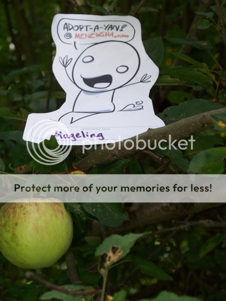 If you look close, it's in the top corner of the picture. It kind of blends in, but isn't that what they're supposed to do? The frog was quick, though, and I wasn't able to catch it for Mini-Yan. He lost interest once it was gone, and turned his formidable attention to the apple tree in the yard. There are apples on it already, don't'cha know.
