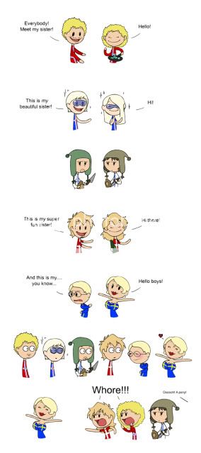 Also, I don't like the way Sister America is portrayed. She kind of took two stereotypes of American women and put them together... The thing is, the Paris Hilton type doesn't really mix with the yaoi fangirl type. It's a little odd seeing a girl with huge sunglasses, fake boobs, and a chihuahua talking about drawing doujinshi.