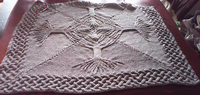 I've since completed the entire braid around the tree in the middle and have started to cast on to make the next border section but I put it away for a bit because at the time it was 110 degrees here and working on a blanket was really not an option, haha.