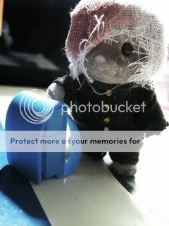 a while ago i melted wax all over my doggu doll's face, so i gave him bandages.