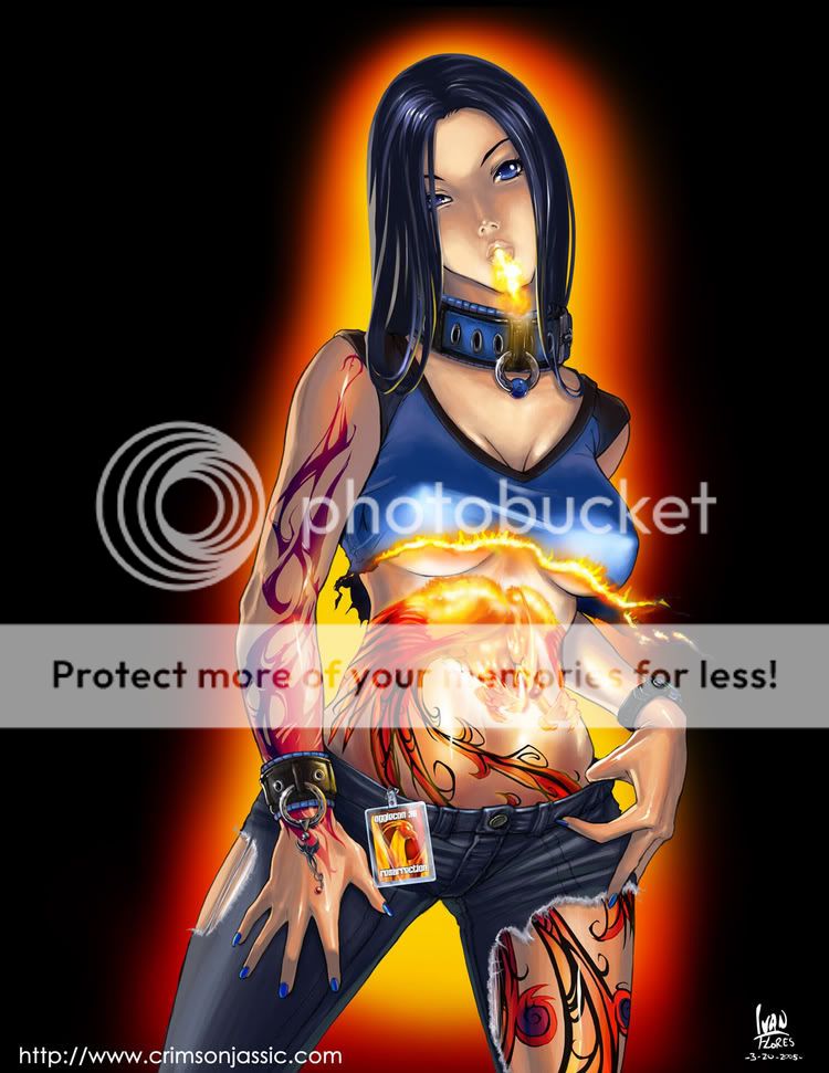 Description (or pic):  Has bright red with gold tipped feathers from the middle of her neck down to her chest, then from her waist to the top of her ankles. She had the tattoos done on the skin so it looks as beautiful as the rest of her body, and can make the pheonix on her belly glow as though it is on fire. Has Fire-Orange Eyes.