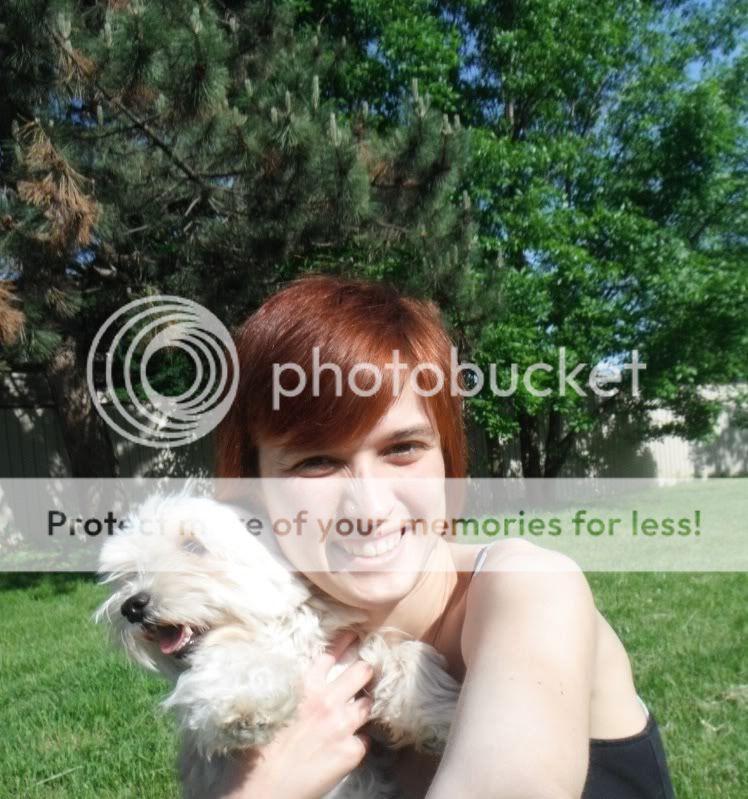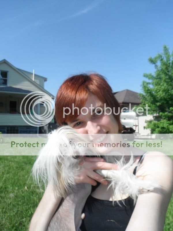 I love the colour I have now. It needs redone badly though. It's normally darker than in the pictures but it's been like a month since I dyed it. The first one is my dog. She wasn't too happy about mommy holding her still. lol She's cute but a little on the hyper side.