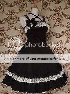Dress: Her dress looks like this except with black fitted long sleeves strarting where the straps end. Must cover the shoulder. Knee high white socks with high-heel mary janes.