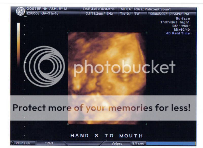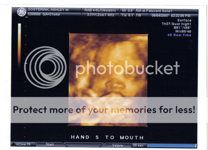 What an awesome set of sono pictures. You're lucky to have gotten the 3D. I was happy because my little one was breach until the very end so they had to order me one more sonogram so they could check everything. Luckily, she turned that morning before they did it and everything worked out ok. But I still got the sonogram and got to see what she looked like at almost full term in there. Plus, they verified that she was indeed a girl (at the sex-determining one, they said they thought she was one, but I wanted more of a definitely than a maybe!).
