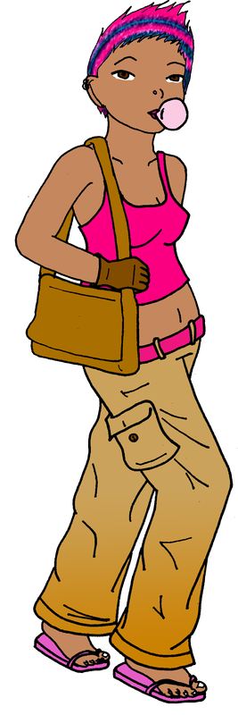 The picture isn't quite done. There's a couple of tiny things missing from the coloring (toenails, earring) and her bag will eventually be covered with pins and patches that haven't yet been designed.
