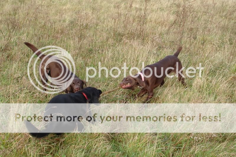 http://i33.photobucket.com/albums/d6...n/DSC02285.jpg - Those are the other two dogs we usually walk with, playing tug-of-war with a stick (they're SODs; Stick Obsessed Dogs xD). Bosco is the black lab, ours. Lola is the chocolate lab. And Deuchar is the brown Weimaraner-cross-pointer. I dog sit him. He's naughty, but great most of the time. x3