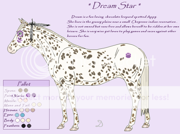 Purple is my favorite color so it used it a lot. And Appaloosa are one of my favorite breeds of horse. Dream Star shows off my more energetic playful side.