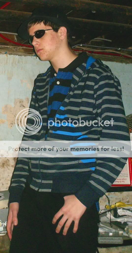 Haio! I am back from the mind-numbingly boring sneeze-fest that is my grandparents' Delewarian home! Aside from a solid reinforcing of the hatred for my family, I return to you with a cool new blue shirt, a black and blue stripey polo, a grey and navy stripey hoodie with a diagonal blue stripe, leather gloves, some black skinnies, and sunglasses! I wore the jeans, polo, and hoodie today and I looked like someone who wasn't dressed by a retarded monkey for once! There's a reason they call me a hipster.