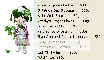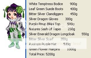 This was somewhat hard without the advantage of new dark purple basics in the MAC @[email protected] theres also no silver only head items or the proper color of green....ones a rare and one is multi hued flowers XD;; I suppose the little christmas cap could work if you need a head item @[email protected];; and on BOTH of these you should layer the dark purple legwarmers on
