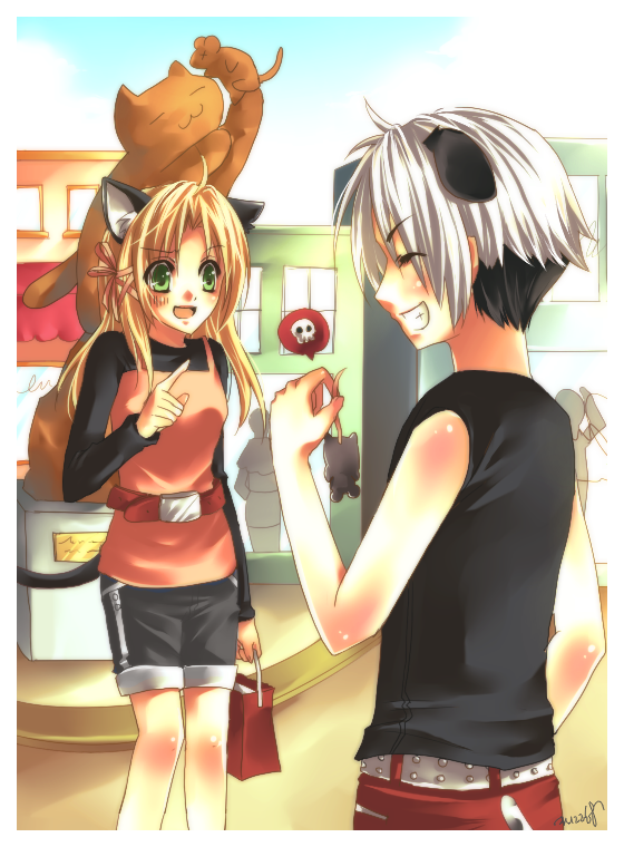 Your anatomy skills are improving so rapidly, and it shows in the way you posed the catgirl in the first picture. Her pose looks very natural, and her hair and the clothing wrinkles are so smooth and professional-looking! The cat-n-mouse statue in the background is really cute, too. It adds to the scene, which is very well thought-out, by the way. ;3